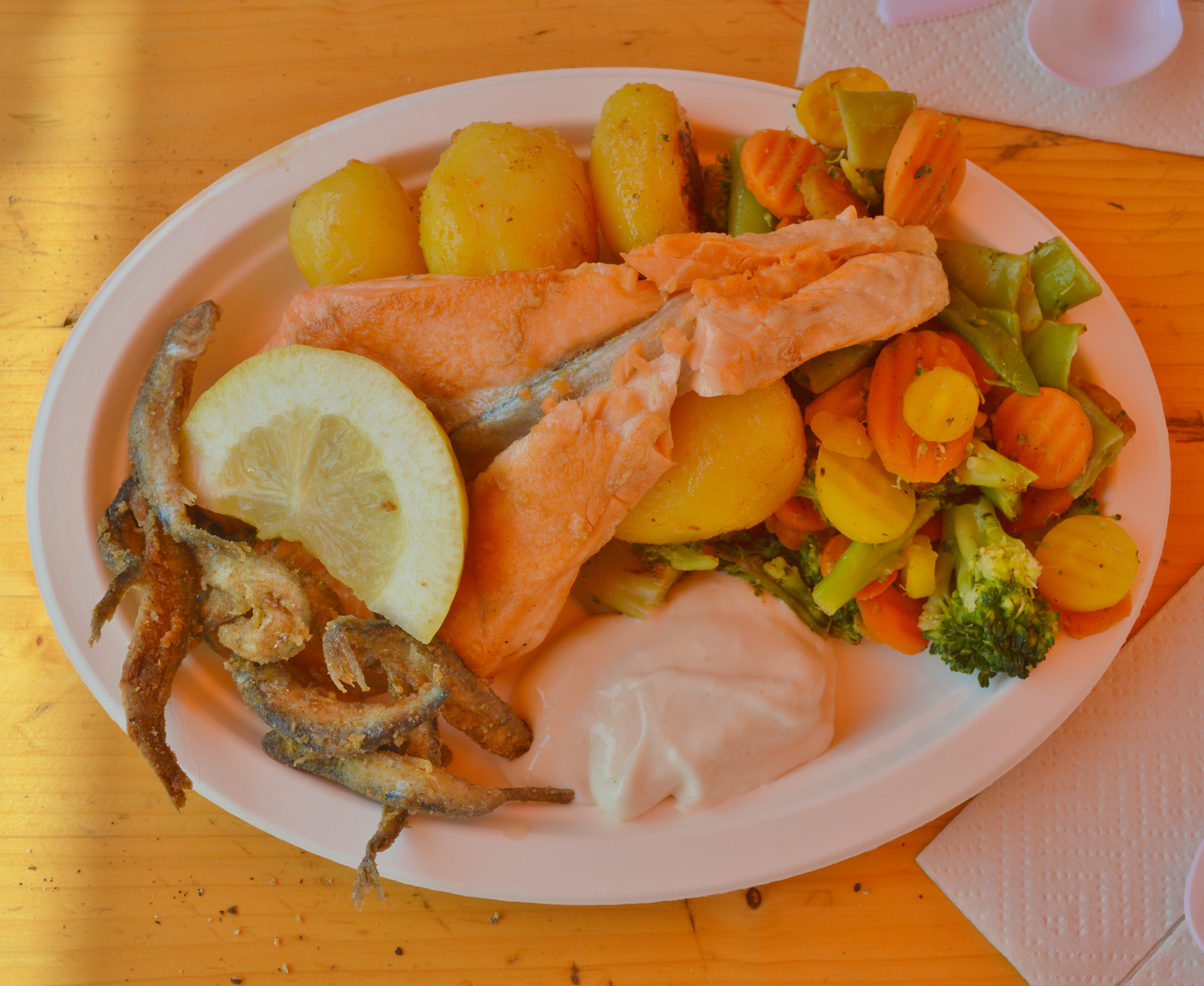 Back at the market, we were starving, so we opted for one of the fish stands and got ourselves a big grilled salmon plate with some nice spiced potatoes and a garlic sauce.