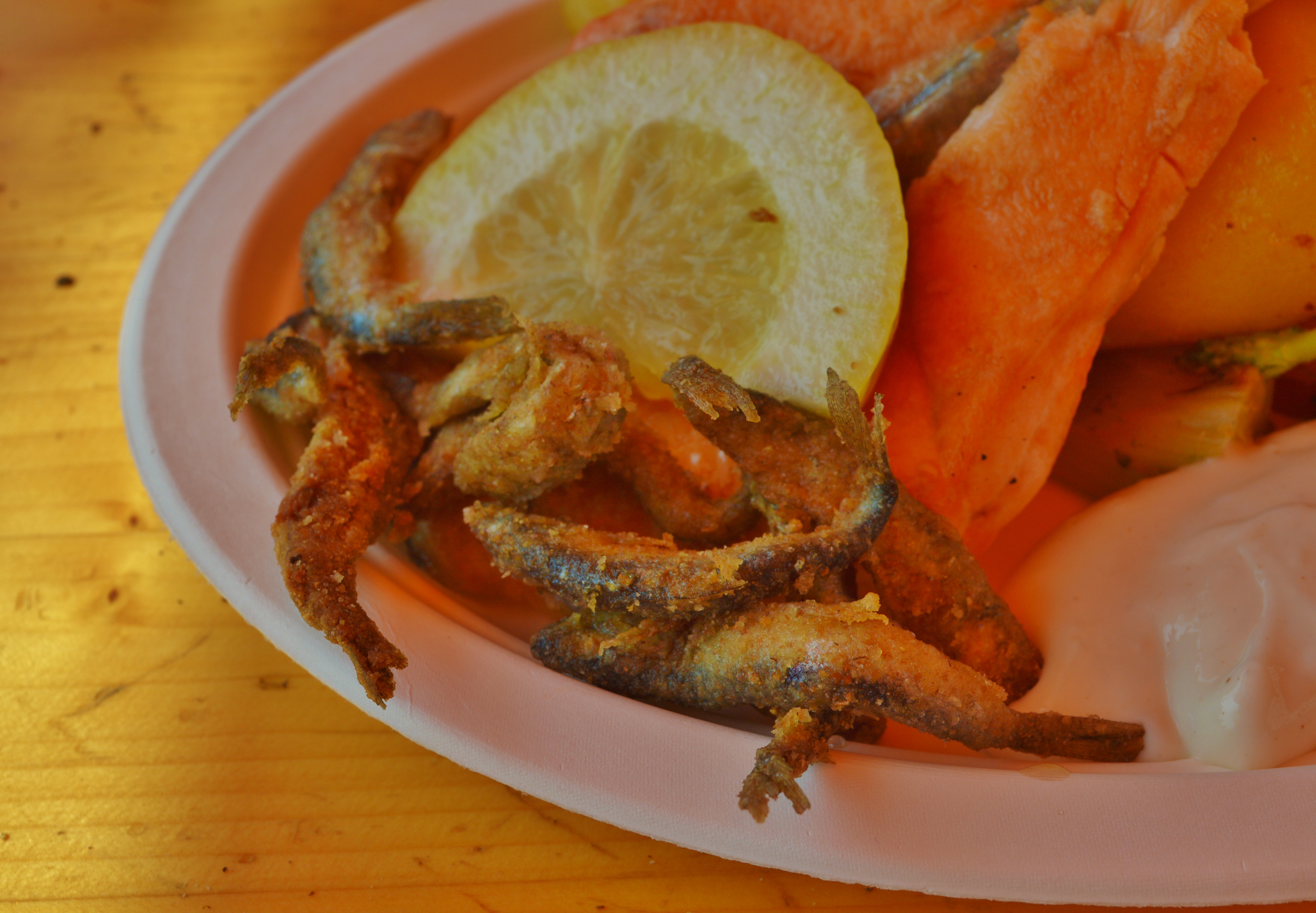 … which I promptly did, earning me a puzzled look from the boyfriend, accompanied by the words, “I never thought YOU’d just eat a fish head!” – I actually hadn’t realized the heads were still on and that I had just bitten one off! Needless to say, I did NOT eat any more of those fishies!