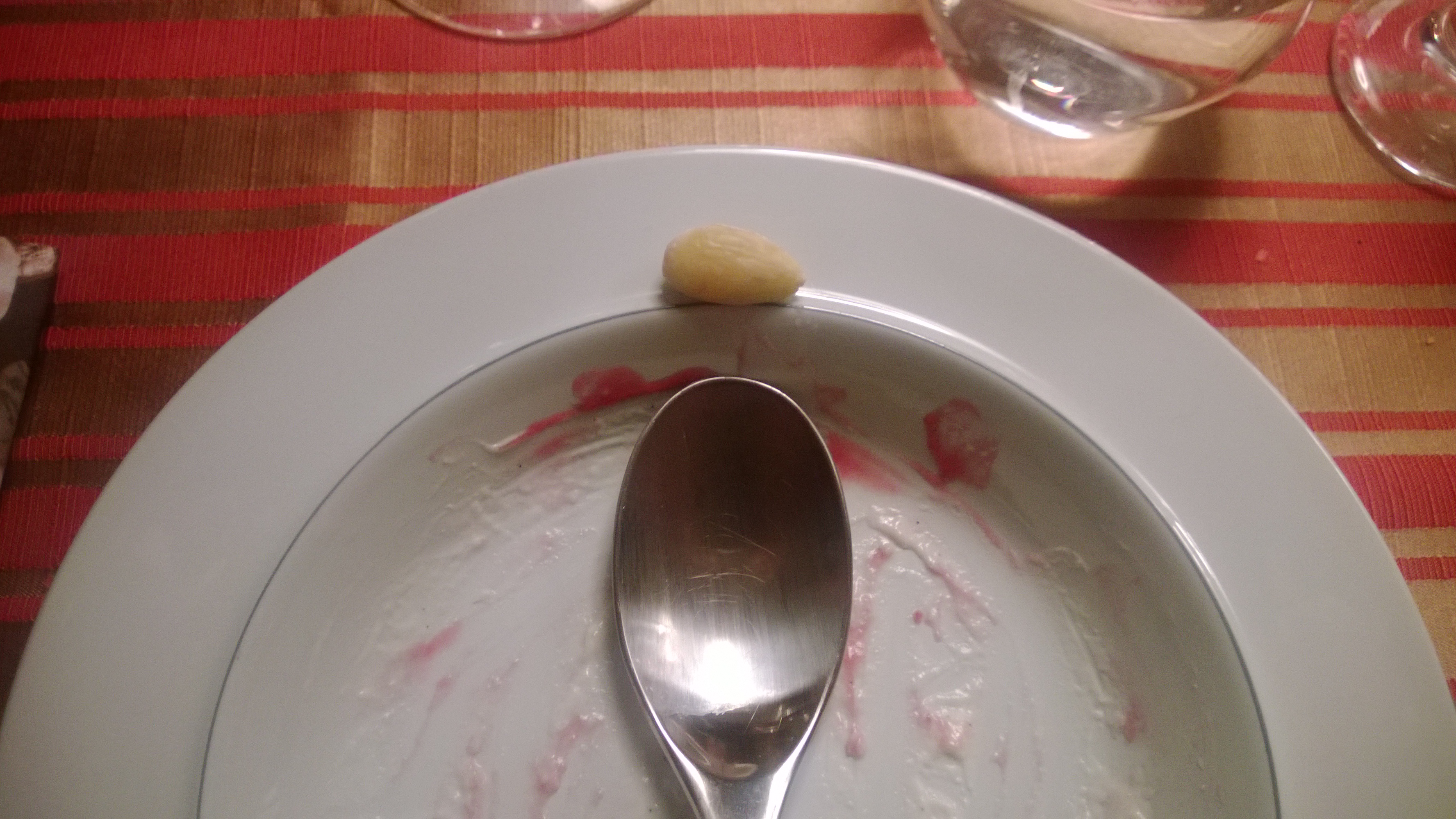 And for dessert, there’s “ris à la mande“, a sweet rice pudding with whipped cream and chopped almonds, with a cherry sauce. In addition to the chopped almonds, there is always one whole almond hidden in the pudding, and whoever finds it, gets a small gift. Since our family Christmas had many kids around, the odds were raised by adding three almonds, and guess who found one? 🙂