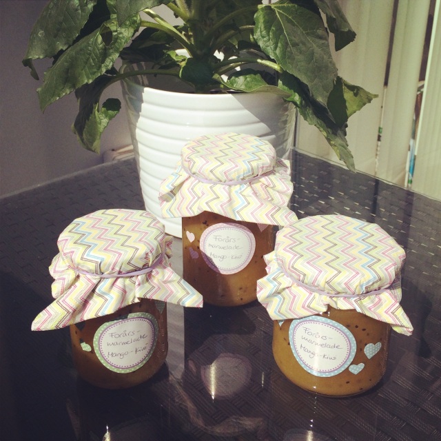 With all that free time on my hands, and inspired by the beautiful weather, I decided it was time to make something again! A nice give-away/ gift for the hosts for the family Easter brunch we’re attending tomorrow. So I decided on a nice jam. My first thought was strawberry-rhubarb (since I still have some rhubarb in the freezer), but I’d rather use fresh rhubarb when it is in season. So I decided on an exotic spring jam with mango, pineapple and kiwi, which turned out quite yummy!
