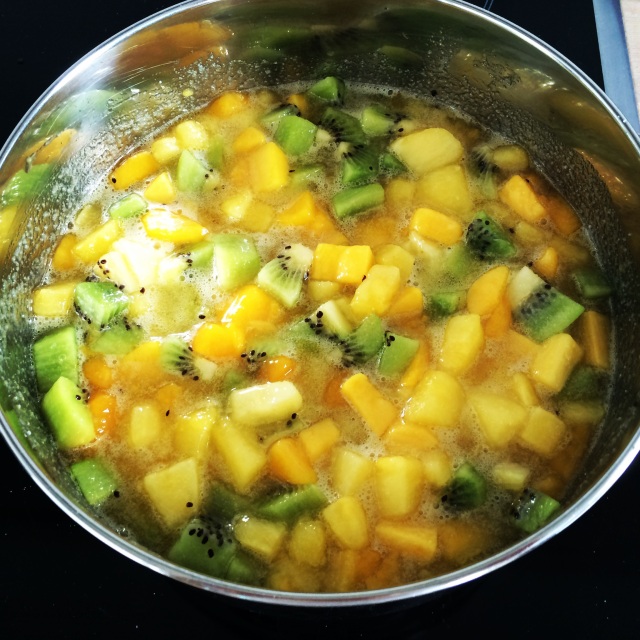 Peel the fruit and cut into small pieces. My kiwis were not overly ripe and therefore still a bit sour, which worked out well to even out the sweetness of the mango and sugar. If you use very ripe and sweet kiwis, maybe add some lemon or lime juice.