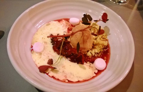 Aaah, dessert. I’m a dessert person. No matter how full I am after the starters and mains, I will always – ALWAYS – have room for dessert. The day that I refuse dessert is the day hell freezes over. And what a beautiful one this one was! A twist on THE Danish classic: “rødgrød med fløde” (red fruit pudding, similar to jam, with cream). Instead of the classic berries that are normally used for the grød, this one was based on plums for a more seasonal element. The dessert also included some meringues, a scoop of home-made ice cream, some nut crunch and flowers… I could eat this every day!